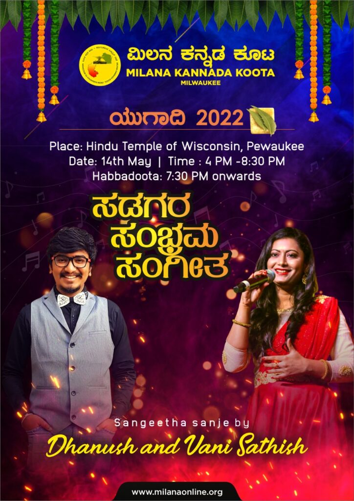Milana Kannada Koota is proud to announce “Sangeetha Sanje” by talented singers Dhanush Jagadish and Vani Sathish who will entertain you all during Ugadi Habba.