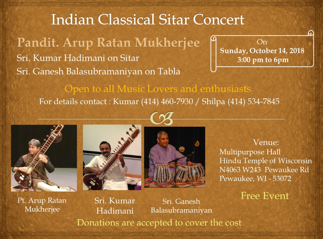 Hindu Temple of Wisconsin N4063 W243 Pewaukee Rd, PewaukeeDear Milana Music Lovers & Enthusiasts, Namaskara, We are pleased to inform you that our own Dr. Kumar Hadimani will be performing along with his guru Pandit Arup Ratan Mukherjee in a Indian Classical Sitar Concert on Sunday, 14 Oct 2018 from 3.00 PM to 6.00 PM at the Multipurpose hall, Hindu Temple of Wisconsin, Pewaukee, WI 53072. Kindly note, this is a free event. However donations are welcome. We encourage you to grace the occasion in large numbers and motivate Dr. Hadimani. Wishing Dr. Hadimani all the best and hope he keeps enthralling us with many more such performances in future. Thank you